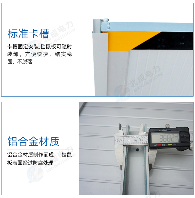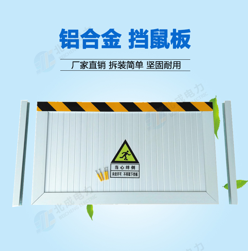 新型鋁合金材質(zhì)擋鼠板替代老式擋鼠板材,實用、結(jié)實、耐用、使用時間長。由擋鼠板主板面和卡槽夠成,外觀可見部分為鋁合金定制,且貼有黃黑色的反光警示貼。